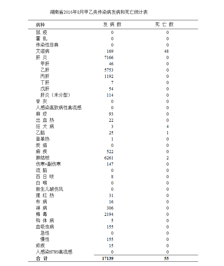 附件:湖南省2016年8月甲乙类传染病发病和死亡统计表