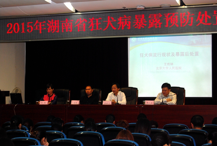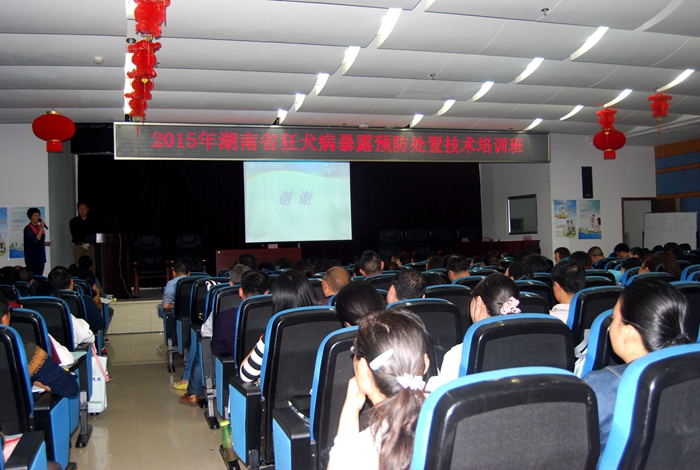 湖南省狂犬病暴露预防处置技术培训班于2015年10月22日至24日在省疾控中心多功能会议厅开班。省疾病预防控制中心党委书记黄跃龙、门诊部主任石琼、湖南永康生物制品有限公司董事长张向东出席培训班开幕并致辞。来自全省各市、县CDC门诊部负责人和一线医护人员共172人参加学习。