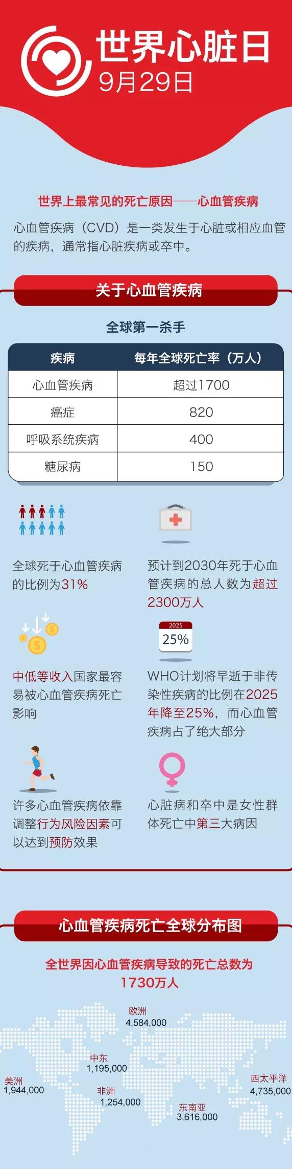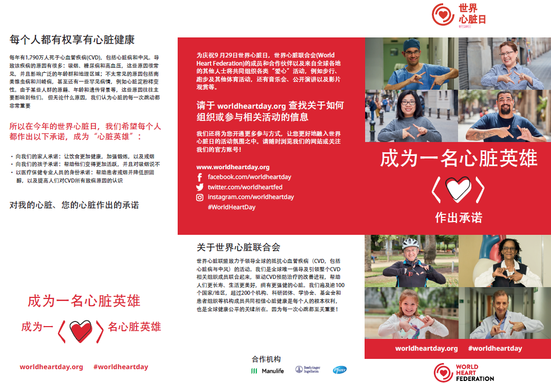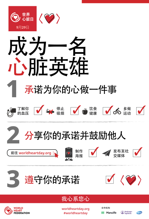 世界心脏日(World Heart Day)是由世界心脏联盟确定的于1999年设立,每年一次。2000年9月24日为第一个世界心脏日,以后每年9月的最后一个星期日为世界心脏日。2011年起,改为每年9月29日 。其目的是为了在世界范围内宣传有关心脏健康的知识,并让公众认识到生命需要健康的心脏。心脏疾病是威胁人类生命健康的头号杀手,为提醒人们的重视。今年世界心脏日的主题是:将心比心(My heart,Your heart!)