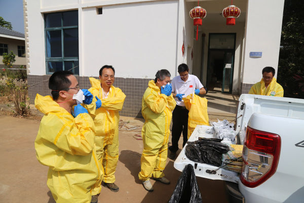 4月1日上午,队员们一早冒着30多度的高温天气配制灭蚊药物。参与消杀的检测队队员张勇、宋敬东、隗合江,培训队队员刘晓强、肖林等身着密不透风的防护服,戴着口罩、护目镜等个人防护装备,背上了几十斤重的喷雾器,顶着炎炎烈日,按照分工轮番上阵,对援塞固定生物安全实验室和援塞公共卫生师资培训队教室周边草地、灌木丛、排水沟等地进行喷洒消杀,确保不留任何死角。这些平日大多工作在实验室内的专家们身背喷雾器,手持压杆,干起活来有模有样。经过在塞拉利昂50多天的各种工作锻炼,这些原本专业之外的“体力活”对于他们来说已不在话下。经过约两个小时的奋战,等到大家脱下防护服时,汗水早已湿透了全身衣物,手套里都能倒出水来,喝水成了此时的第一需求。尽管十分辛苦,然而大家毫无怨言,简短休息一下,立刻投入到下一项工作中去。