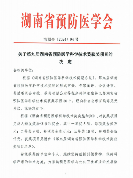 近日,在湖南省预防医学会发布的《关于第九届湖南省预防医学科学技术奖获奖项目的决定》中,我中心慢性病预防控制所(以下简称“慢病所”)申报的科技成果《湖南省慢性病综合防控体系研究》荣获科学技术一等奖。