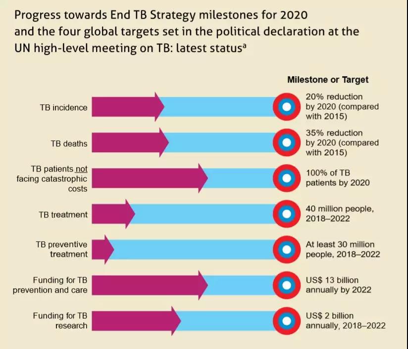 全球范围内,小部分区域和高负担国家的指标进展较快,但总体来说,如果没有充足的防治和研究资金投入,以及新的诊断工具和预防结核病感染新疫苗、新药品的出现,联合国可持续发展目标(SDG)和终止结核病策略(END TB STRATEGY)的目标将难以实现。