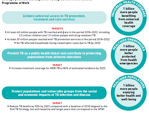图2显示了与GPW一致的结核病目标。为了促进全球努力支持这些目标的实现,世卫组织、遏制结核病伙伴关系和抗击艾滋病、结核病和疟疾全球基金发起了一项名为“发现、治疗、所有”的联合行动(见表框1)。