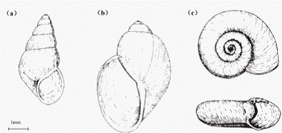 (a):钉螺;(b):水泡螺;(c):双脐螺