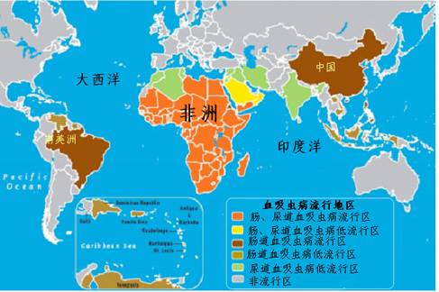 (四)埃及血吸虫病主要流行于大部分非洲国家,流行范围从东非苏丹、埃塞俄比亚、坦桑尼亚至岛国毛里求斯与留尼日瓦;中非大部分;西非从尼日利亚向南,直到安哥拉;北非从埃及至摩洛哥。其中非洲的突尼斯、阿尔及利亚、摩洛哥、毛里塔尼亚、几内亚比绍、尼日尔,索马里和毛里求斯只有埃及血吸虫病,其他国家则有埃及和曼氏血吸虫病同时流行。除非洲外,欧洲南面的葡萄牙南部与亚洲西部塞浦路斯;中东黎巴嫩、叙利亚、伊拉克与伊朗以及印度孟买南部也发现有本病流行区。