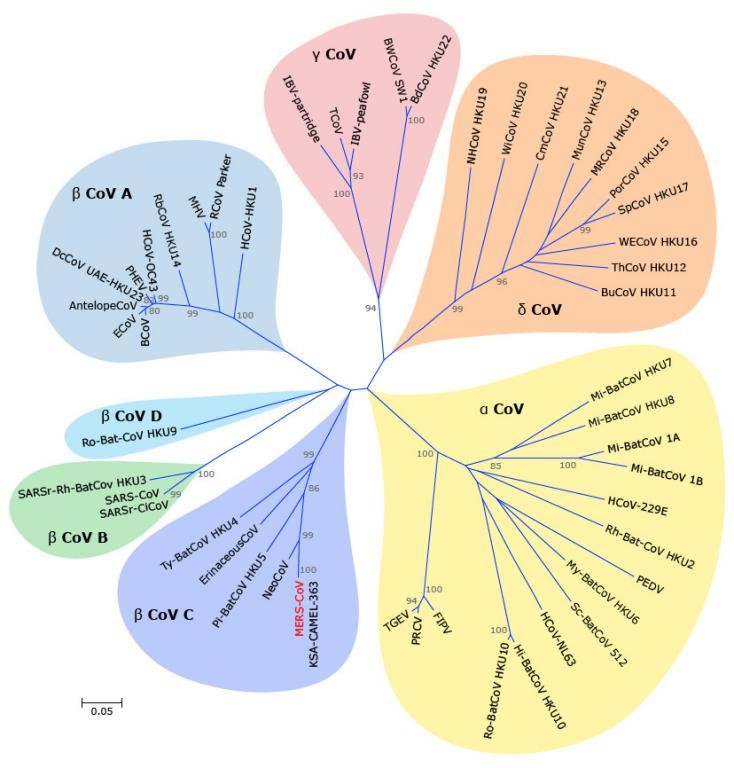 根据系统发育树,冠状病毒可分为四个属:α、β、γ、δ,其中β属冠状病毒又可分为四个独立的亚群A、B、C和D群[3]。