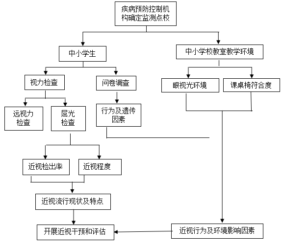 各地疾病预防控制机构制定本地学生常见病及健康影响因素监测实施方案,组织相关培训,做好现场调查和监测、数据录入、结果分析与上报等工作。近视监测流程图见图3。逐级撰写当地近视监测和评估报告,并将监测及评估报告及时报告政府并通报教育行政部门,结合当地实际情况,制定或调整近视干预措施和活动,将主要信息通过媒体向社会公布。
