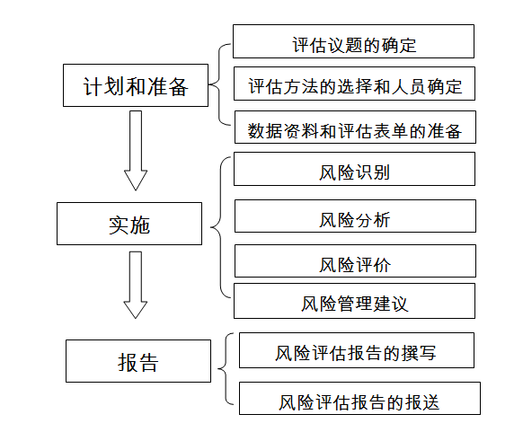 计划和准备包括评估议题的确定、评估方法的选择和人员确定、数据资料和评估表单的准备等;实施包括风险识别、风险分析、风险评价和提出风险管理(预警、控制措施等)建议;报告包括风险评估报告的撰写和报送等。