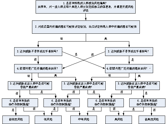 当出现某种特定公共卫生相关因素尚未对公众造成影响时,从该因素的特征(如致病力、传播力等)入手,依次列出相应的影响因素和关键环节(如传播机制实现的程度、易感人群等),进而推断可能造成的危害及严重程度,同时,充分考虑人群和控制措施有效性等因素,评价该因素造成的风险可能性、危害性和脆弱性,确定风险等级。如欧盟在传染病快速风险评估指南中提供的分析流程(图2)。