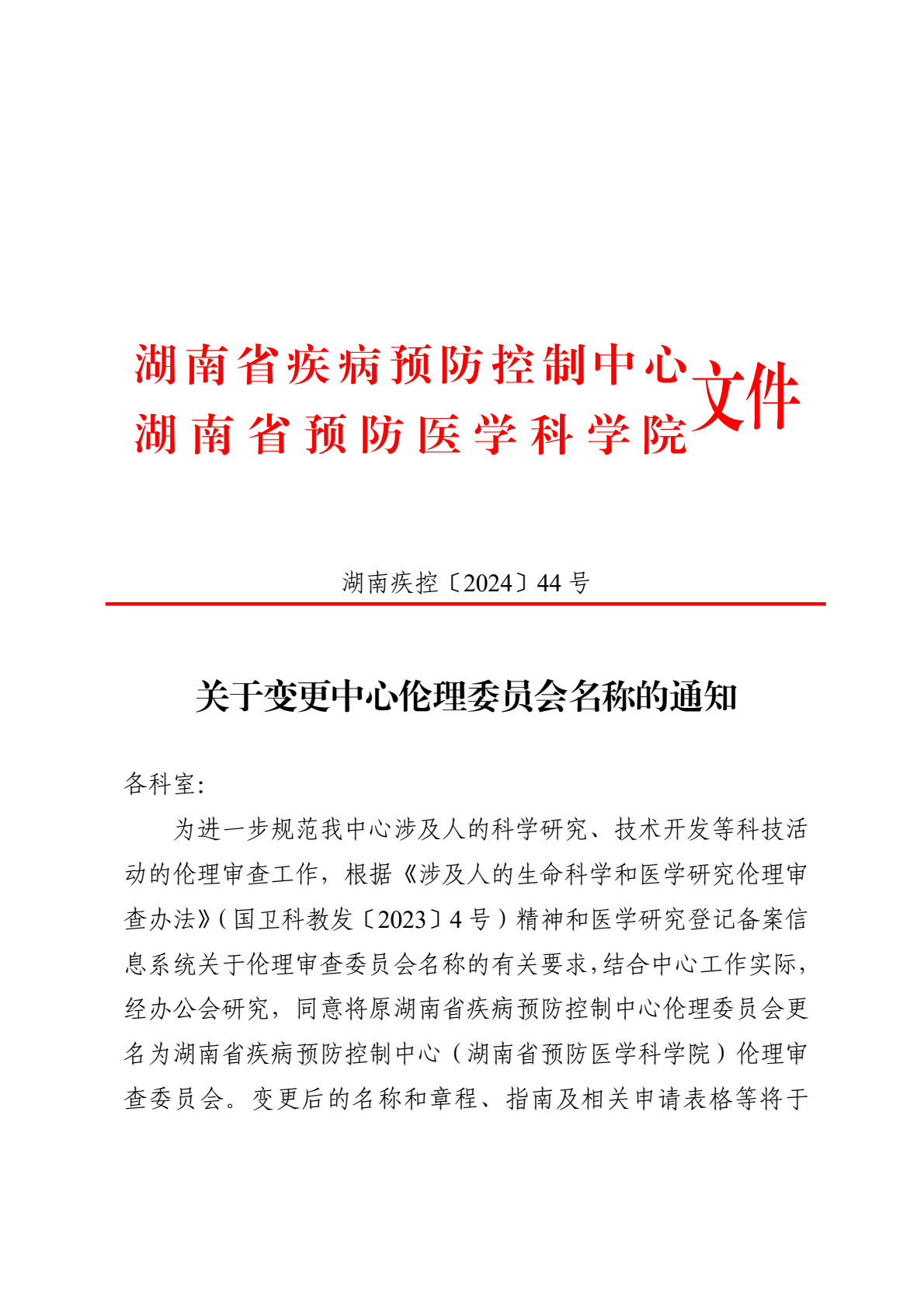 关于变更中心伦理委员会名称的通知