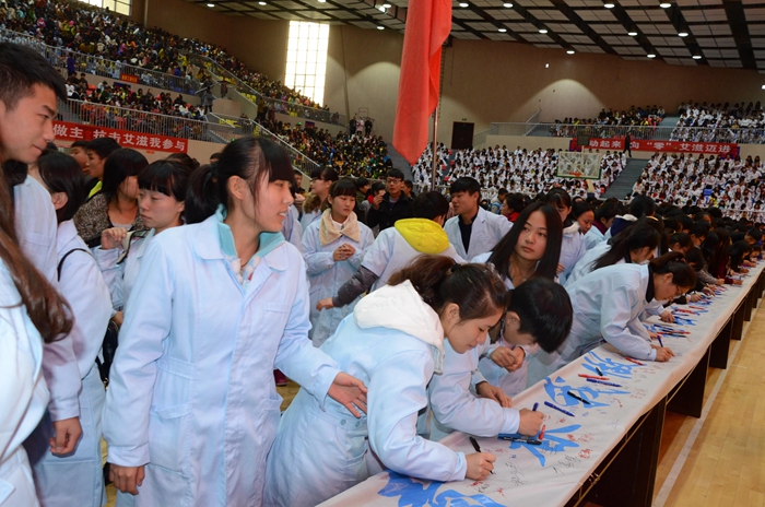 常德职业技术学院是一所以医药卫生和工科专业为主的全日制国有公办普通高等学校,现有在校学生1.2万余人。学院院长杨文明在活动现场倡导:大学生作为预防艾滋病的生力军,要提高自我道德修养,强化性道德意识和性安全意识,加强艾滋病科普知识学习,积极参与有关活动,奉献爱心,消除歧视。学生代表刘亮亮代表全院学生庄严宣誓:当好艾滋病防治志愿者,投身到艾滋病防治工作中去,承担共同抗击艾滋病的社会责任。
