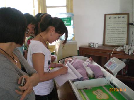 图为项目组工作人员在召开试验实施方案讨论会 图为项目实施负责人湖南省疾控中心主任助理、毒理科科长胡余明为乳母讲解注意事项 图为医院工作人员为项目参与婴儿进行体检 图为项目组工作人员为婴儿进行生长发育指标测定 图为项目组为项目参与成员家属进行健康知识讲座