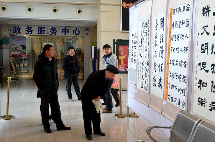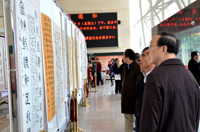 此次书法展览,主办单位收到了来自全国各地的书法家和书法爱好者近300幅书法作品,路途最远的有北京、重庆、天津等地,年纪最大的有近90岁的老艺术家,年龄最小的是不足十岁的小学生。这次展出的百余幅书法作品,是由省、市、区著名书法家组成的评审小组,从300件送展作品中,精选出来的上乘力作,纵观整场书展,尽管书体、风格不尽相同,但都能巧妙地将知识性、艺术性、观赏性相统一,以至于开幕当天就吸引了来区政务中心办事的200余人驻足观赏,还有近百名从市内各处闻讯而来观展的书法爱好者。