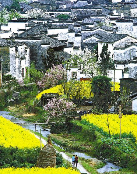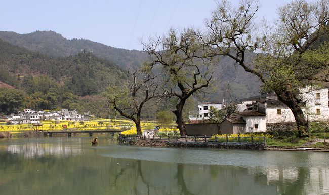在水墨山水般的婺源远眺卧睡在仙境里的月亮湾、“伟人故里”江湾、“中国最美村庄”汪口、田园风光与小桥流水人家融为一体的古镇李坑、拥有十万亩油菜花梯田的江岭,游客们踏着百年老街的青石板上,俯身靠在高昂的马头墙壁轻抚精美的砖木石雕,如何不让人惬意盎然,流连忘返。