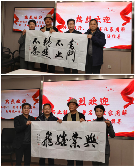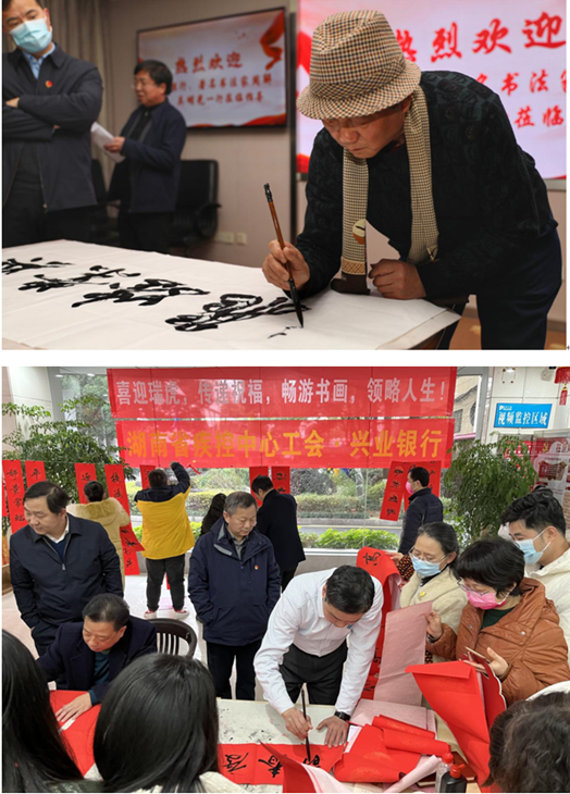 为进一步丰富职工文化生活,迎接虎年新春的到来,2022年1月14日,湖南省疾控中心工会联合长沙市兴业银行江滨支行开展“喜迎瑞虎传递祝福,畅游书画领略人生”送春联主题活动,为中心全体职工送上新春祝福。来自湖南省书法家协会会员周解新、中国人民大学徐悲鸿艺术研究院高级研修生、中国民革黄兴书画院理事吴明光以及任职于湖南省疾控中心的湖南省直书画协会书画家胡李平三位老师现场挥毫泼墨书写新春寄语。中心党委书记黄跃龙、中心主任高立冬以及在家领导、兴业银行零售行长唐海燕女士参加现场活动。